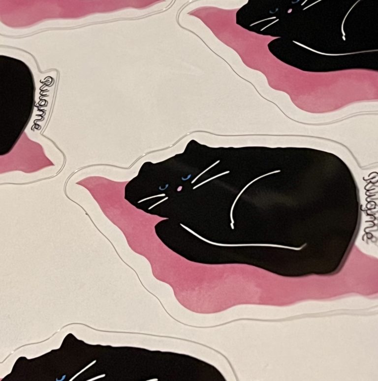 ラグニャンステッカー配布中 只今、タフティングワークショップ参加の方、ラグを購入のお客様にラグミーオリジナルステッカーをプレゼントしております! ラグの上でリラックスしてる白猫、黒猫のステッカーでとても可愛いです!携帯の